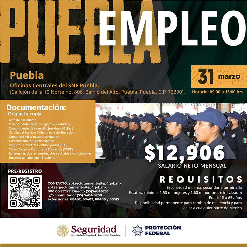 El personal de reclutamiento del SPF estará el 31 de marzo, en un horario de 09:00 a 15:00 horas en el Servicio Nacional de Empleo en Puebla, ubicado en Callejón de la 10 norte 806, Barrio El Alto, Puebla, Puebla.