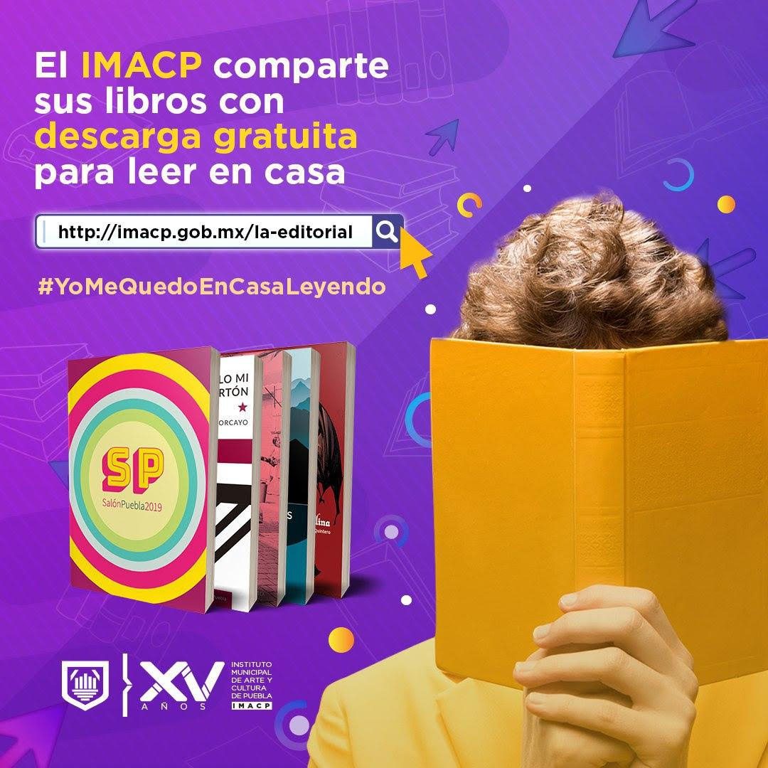 Para fomentar la lectura y el consumo cultural, así como contribuir al entretenimiento en el hogar durante la cuarentena derivada de la contingencia sanitaria por el virus COVID-19, el Gobierno de la Ciudad, a través de la Editorial Instituto Municipal de Arte y Cultura de Puebla, encabezado por Miguel Ángel Andrade Torres, pone a disposición de las y los poblanos quince títulos de lectura descargable de manera gratuita en el sitio web www.imacp.gob.mx/la-editorial.