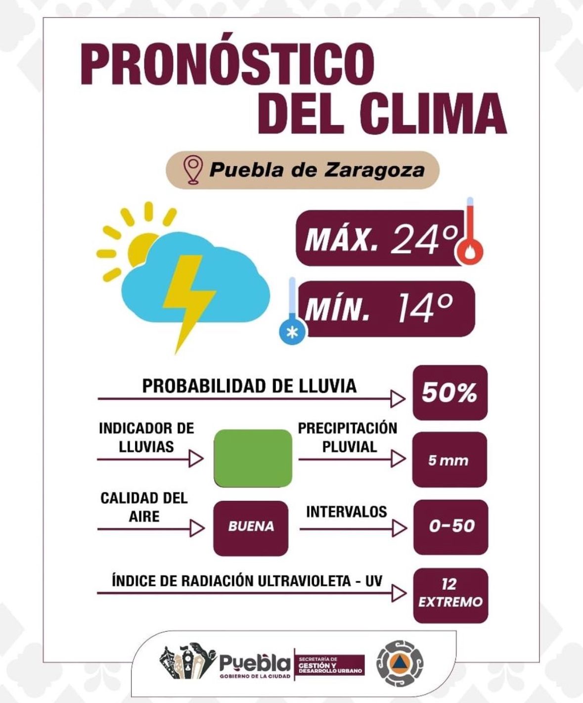 La Dirección de Gestión de Riesgos en materia de Protección Civil de la Secretaría de Gestión y Desarrollo Urbano, informa que se esperan condiciones parcialmente nubladas, con una probabilidad media de lluvias acompañadas de tormentas eléctricas durante la tarde, aproximadamente a las 17:00 horas. La acumulación de agua se estima entre 0 a 5 mm. Se recomienda a la ciudadanía tomar precauciones en caso de actividad eléctrica y mantenerse atentos a actualizaciones oficiales.