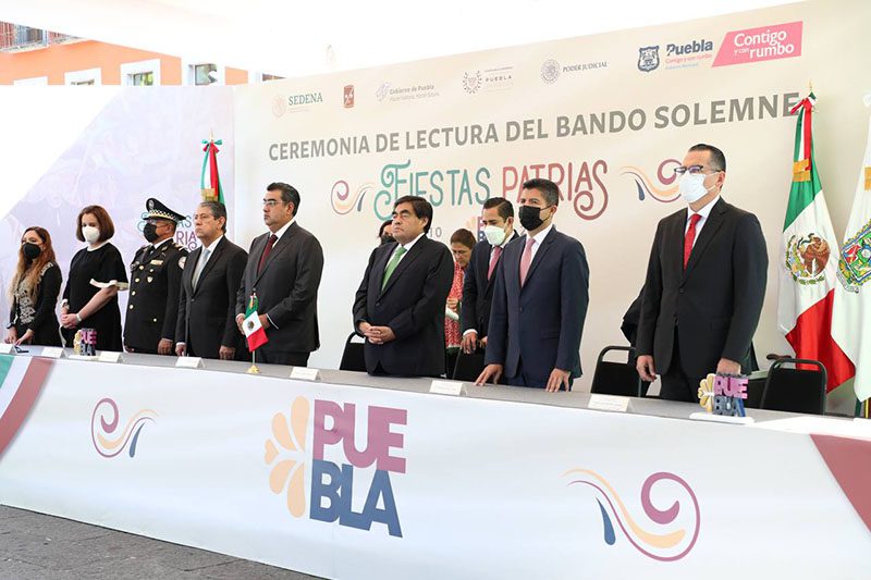 Con la colocación y lectura del Bando Solemne alusivo a las Fiestas Patrias 2022, autoridades de los tres poderes del Estado, encabezadas por Miguel Barbosa Huerta, Gobernador de Puebla, y Eduardo Rivera Pérez Presidente Municipal, marcaron el inicio de las celebraciones conmemorativas por el 212 Aniversario de la Independencia de México que se realizarán durante el mes de septiembre.