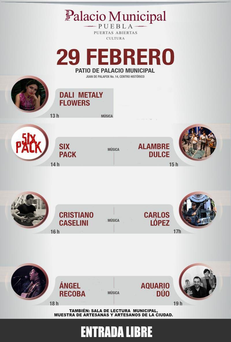 La cartelera de este sábado que forma parte del programa permanente que implementa el Gobierno Municipal de Claudia Rivera Vivanco, a través de la Oficina de Presidencia que preside Javier Palou García, iniciará a las 13 horas para concluir la programación a las 19 horas con entrada totalmente gratuita.