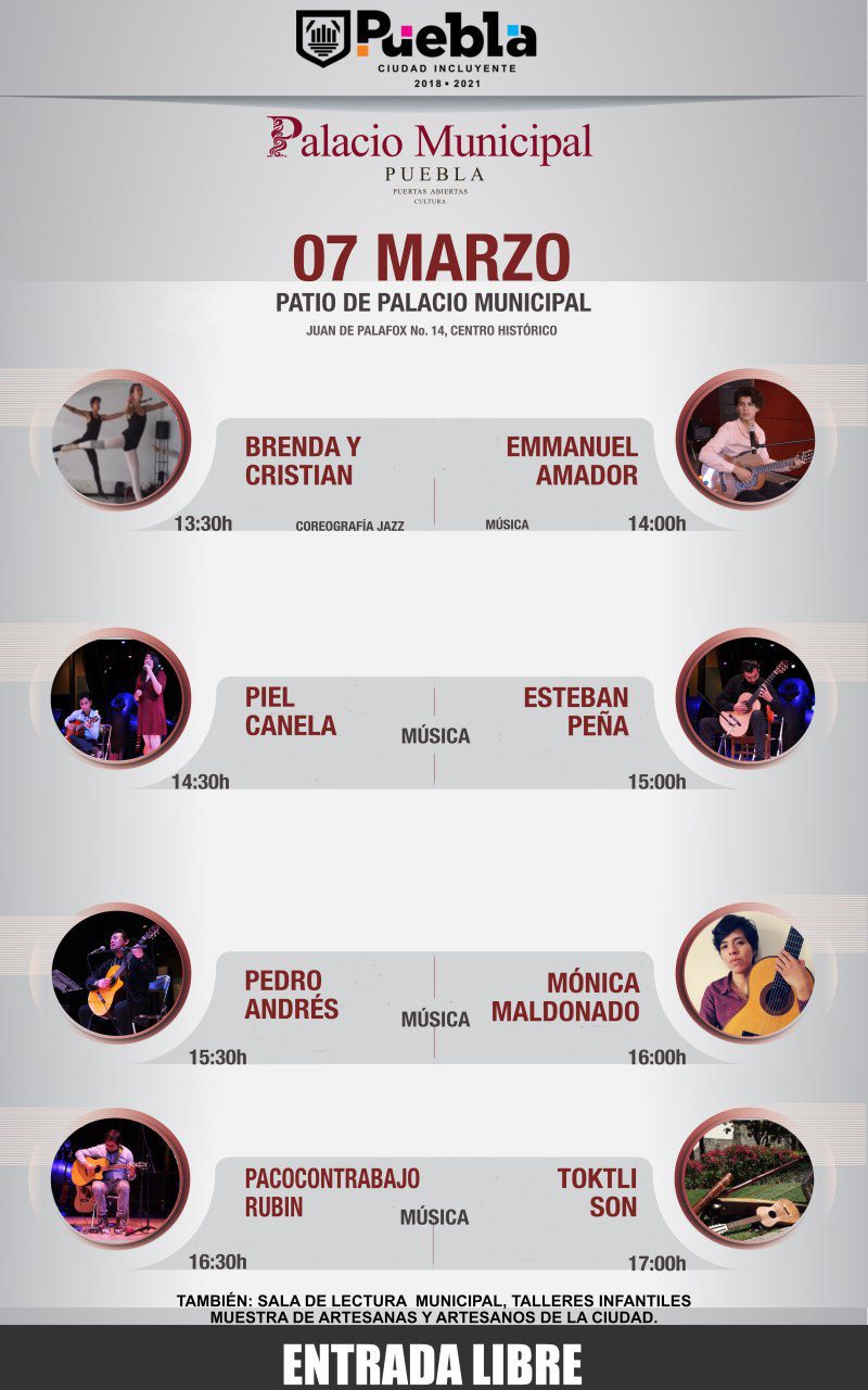 Este sábado 7 de marzo habrá música y danza como parte de la cartelera de los sábados de Puertas Abiertas en el Palacio Municipal de Puebla, programa permanente que implementa el Gobierno de la Ciudad de Puebla presidido por Claudia Rivera Vivanco, a través de la Oficina de Presidencia, encabezada por Javier Palou García.