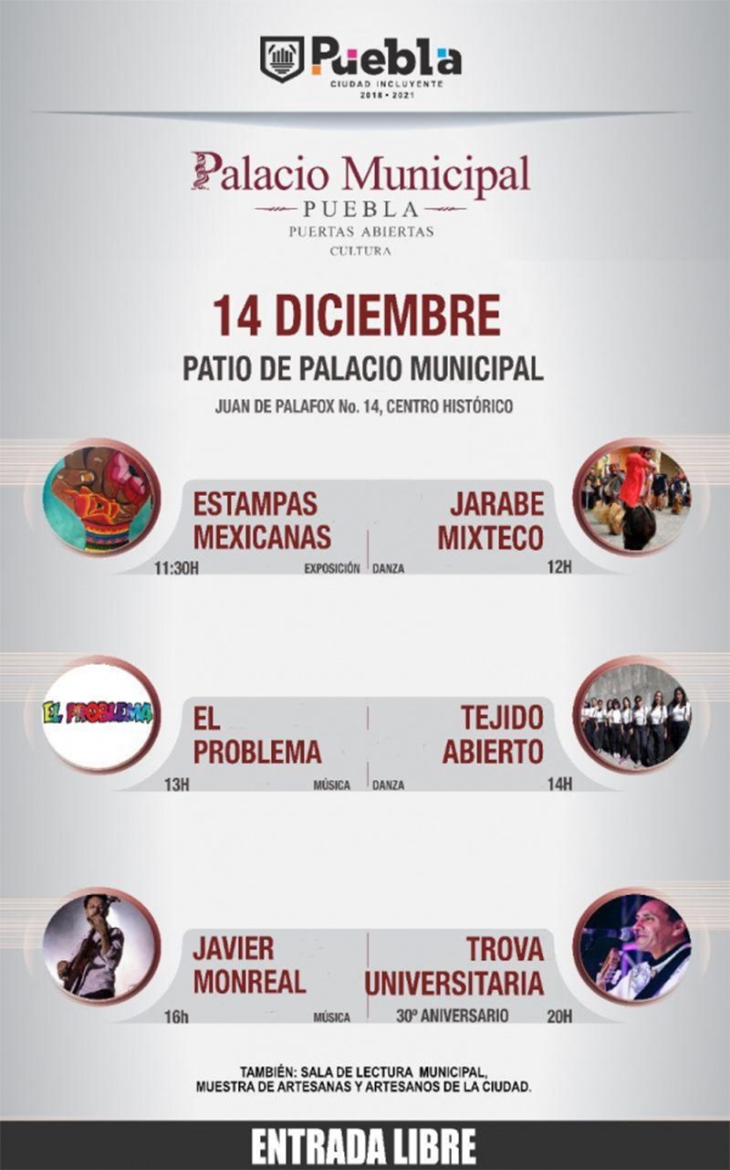 Por esto, todas las actividades artísticas y culturales que se realizan en el Palacio Municipal de Puebla son de acceso libre para las y los poblanos, así como para quienes visitan la ciudad, de tal manera que puedan disfrutar de este recinto histórico.