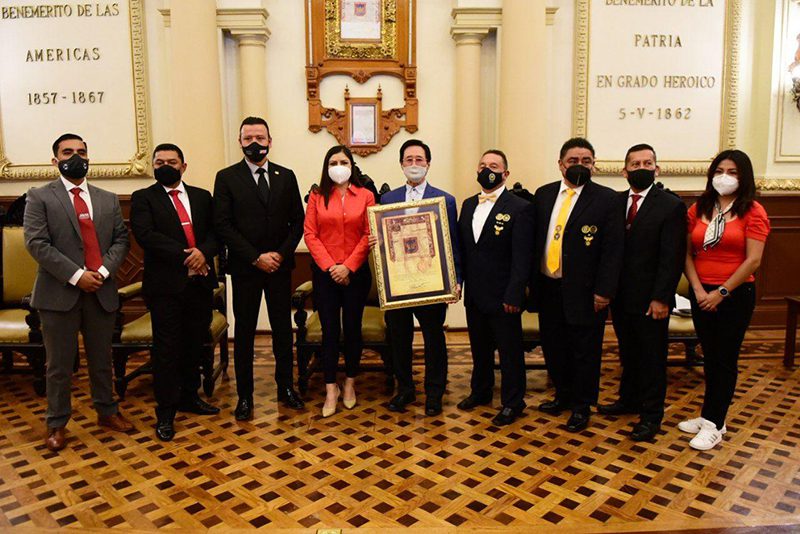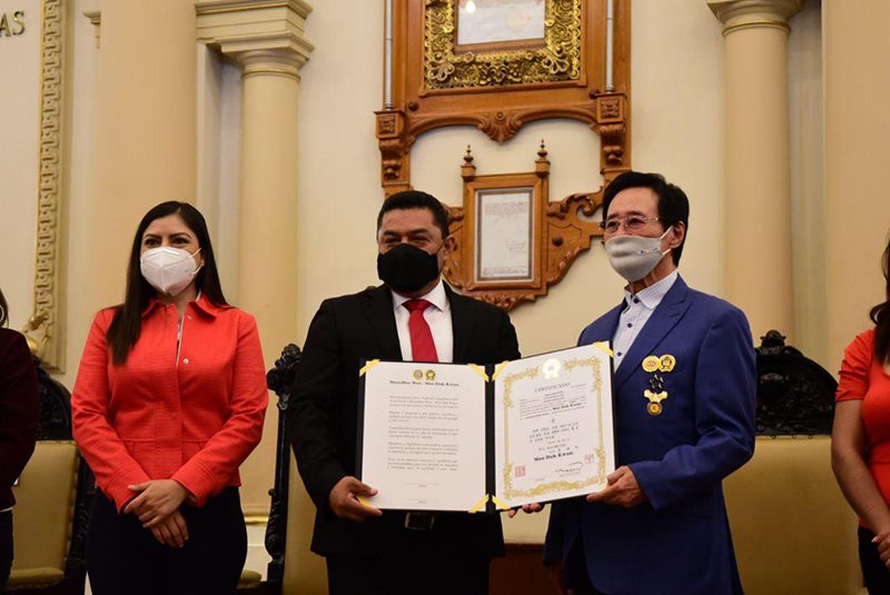 La Presidenta Municipal, Claudia Rivera Vivanco, hizo entrega al maestro, Dai Won Moon, una copia de la Real Provisión, en reconocimiento de su virtuosa trayectoria marcial y deportiva en el país.