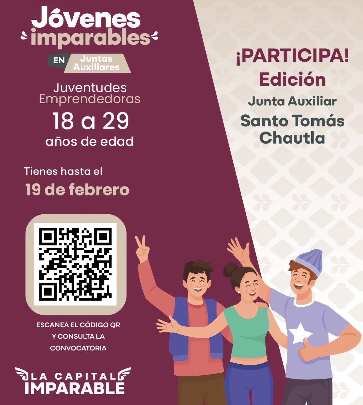 Con el compromiso de fortalecer el desarrollo local y generar más oportunidades para las juventudes, el alcalde, Pepe Chedraui, impulsa la convocatoria “Jóvenes Imparables en Juntas Auxiliares”, un programa del Instituto de la Juventud del Municipio de Puebla (IJMP) dirigido a este sector de la población del municipio.