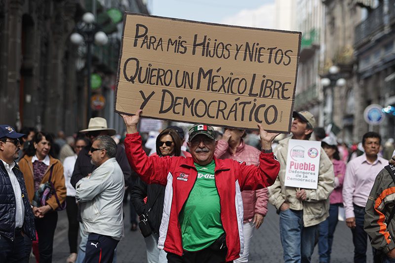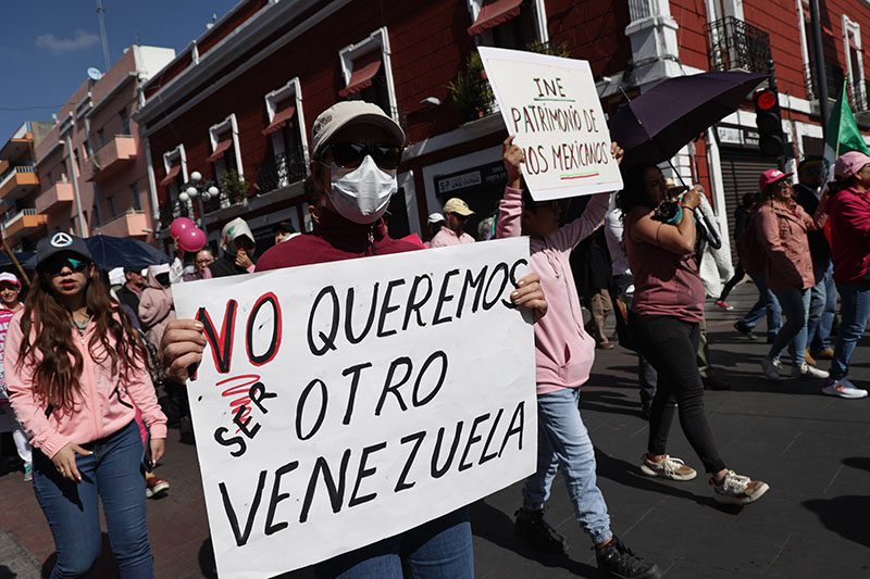 “Puebla defensora de la democracia. Democracia por Hijos y Nietos”, son parte de las consignas que se logran leer, donde se remarca la inconformidad por las 20 reformas de ley que pretende hacer el presidente de México.
