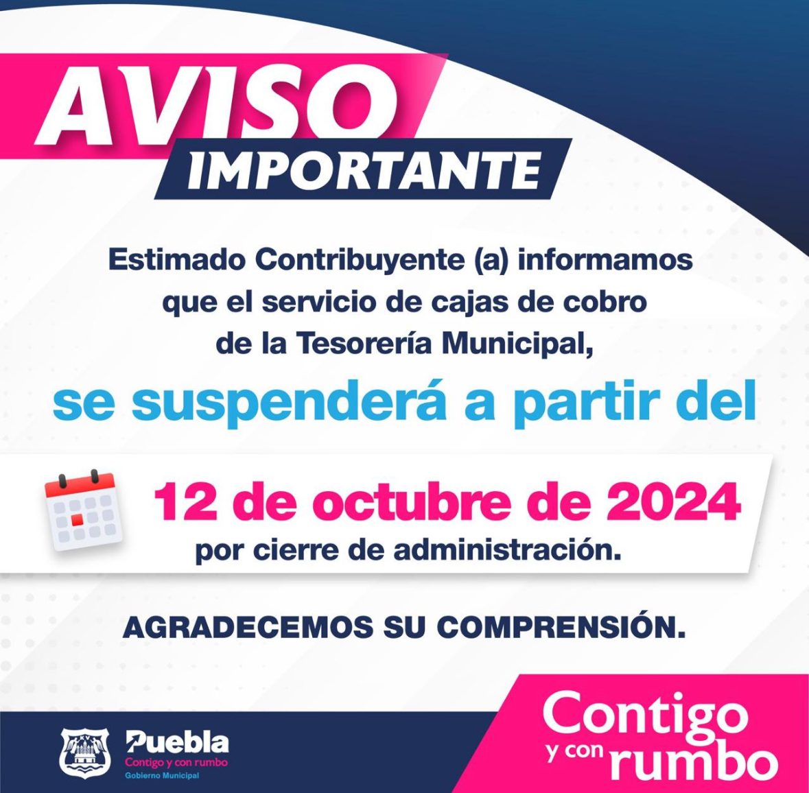 El Ayuntamiento de Puebla, a través de la Tesorería Municipal, informa que el servicio de las cajas de recaudación de la Tesorería Municipal se mantendrá suspendido a partir del 12 de octubre de 2024 por cambio de administración, por lo que se solicita tomar las previsiones necesarias.