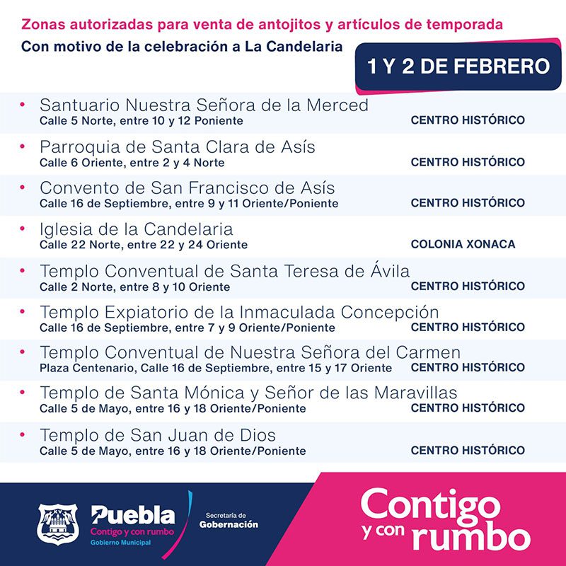 Con motivo de las celebraciones populares a la Candelaria, el Ayuntamiento de Puebla que encabeza Eduardo Rivera Pérez, a través de Gobernación Municipal informa que este 1 y 2 de febrero se autorizará la venta de antojitos y artículos de temporada en inmediaciones de nueve complejos religiosos que se ubican en distintos puntos de la ciudad.