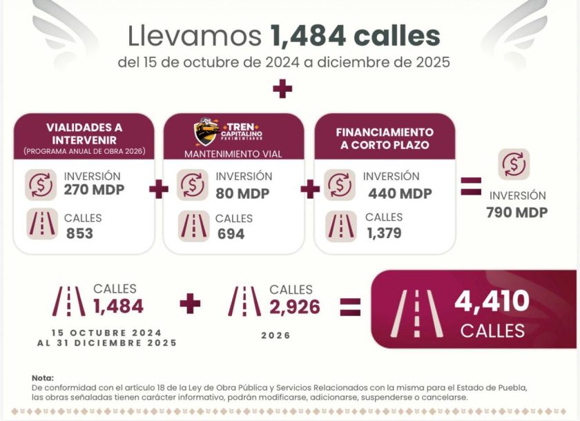“Del 15 de octubre de 2024 al 31 de diciembre de 2025 intervenimos un total de mil 484 calles, mismas que sumadas a las 2 mil 926 calles que atenderemos este año, nos permitirá entregar a las y los poblanos un total de 4 mil 410 calles totalmente renovadas”, precisó.