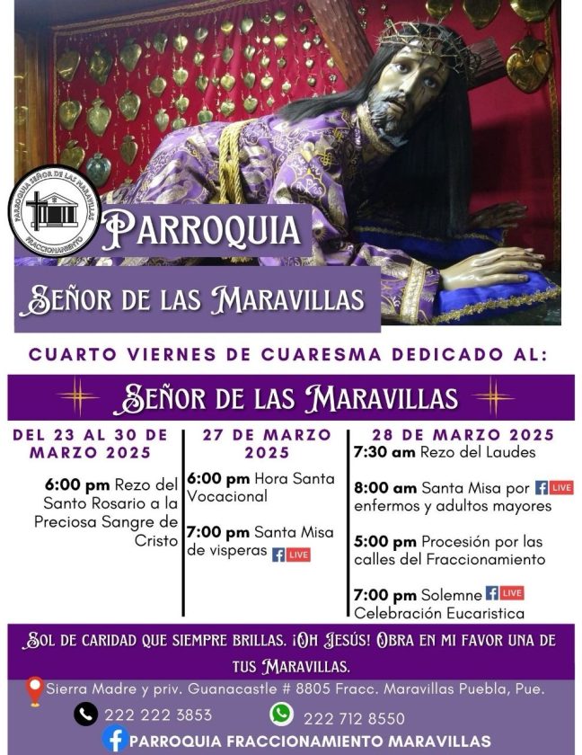 La Arquidiócesis de Puebla invita a la comunidad a participar en estas actividades de fe y devoción. Además, quienes no puedan asistir de manera presencial podrán seguir las transmisiones en vivo a través de la página oficial de Facebook de la Parroquia Fraccionamiento Maravillas.