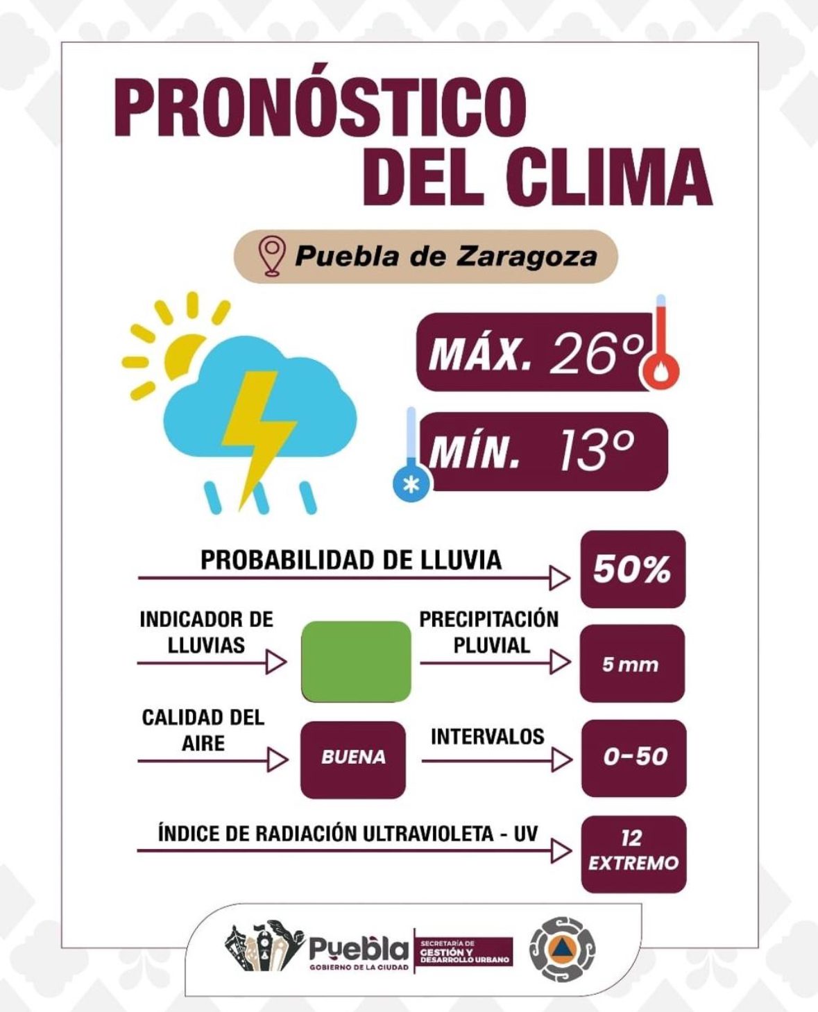 El Gobierno de la Ciudad, informa que de acuerdo con el reporte emitido se prevé un día parcialmente nublado con media probabilidad de lluvia acompañada de tormenta eléctrica durante la tarde, esperándose una acumulación aproximada de 0 a 5 mm entre las 16:00 y 20:00 horas. La temperatura oscilará entre una máxima de 26°C y mínima de 13°C. El índice UV será extremo, por lo que se exhorta a la población a proteger su piel evitando la exposición directa al sol. La calidad del aire es buena, permitiendo actividades al aire libre sin restricciones.