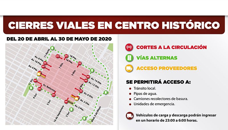 En este sentido, desde el pasado 20 de abril y hasta el próximo 30 de mayo, quedará restringido el paso de automóviles en el siguiente cuadrante: 11 Norte, de Avenida Reforma a 16 Poniente; 3 Oriente, de 9 Sur a Avenida 16 de Septiembre; 2 Norte, de 2 a 18 Oriente y 18 Oriente, de 3 a 7 Norte. Debido a lo anterior, se fijaron como rutas alternas: Avenida 11 Sur – Norte, 2 Norte – Sur, 3 Poniente – Oriente y Bulevar 5 de Mayo.