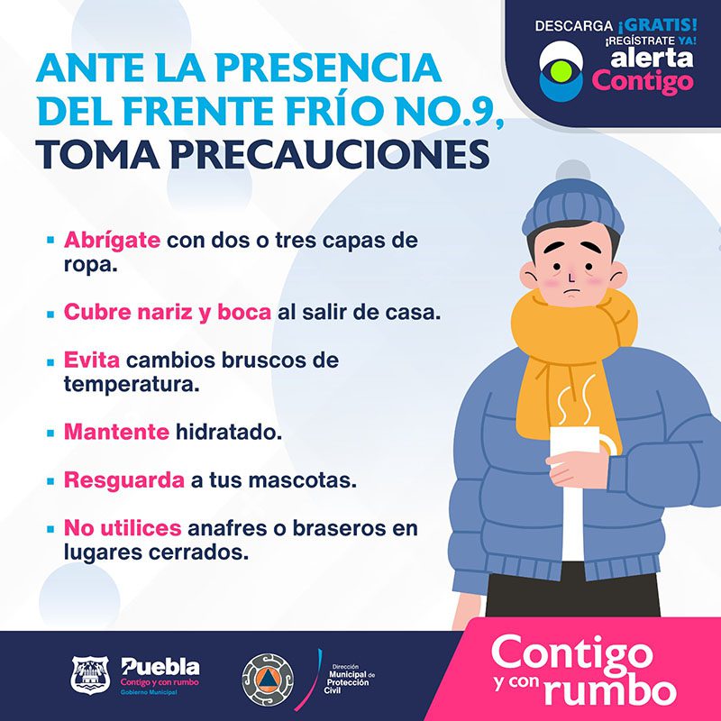 La Secretaría de Seguridad Ciudadana (SSC) del Municipio de Puebla, a través de la Dirección de Protección Civil Municipal, hace un llamado a la población a tomar precauciones ante la presencia desde ayer martes del frente frío no. 9 en México.