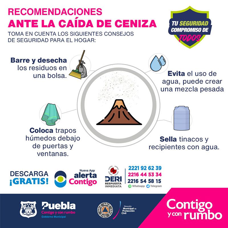 Debido a la actividad que el volcán Popocatépetl ha registrado en los días recientes y horas, provocando la caída de ceniza, la Secretaría de Seguridad Ciudadana (SSC) de Puebla, a través de la Dirección de Protección Civil Municipal, exhorta a la ciudadanía a tomar precauciones y medidas de cuidado.