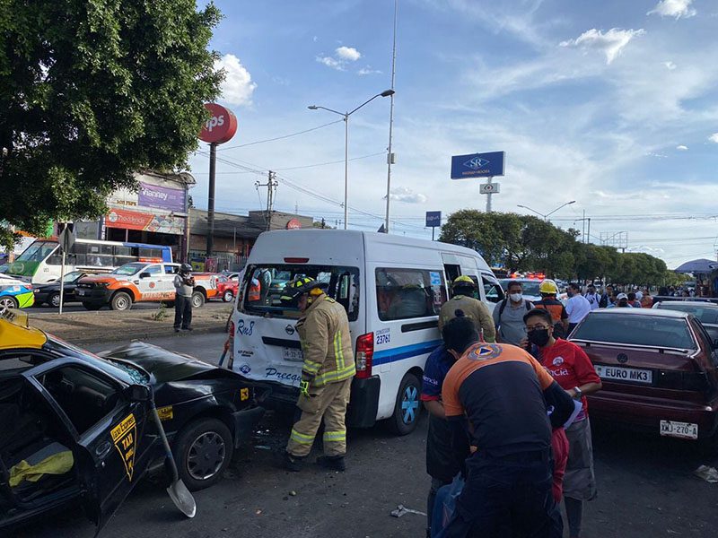 El percance vehicular ocurrió entre tres unidades del transporte público y dos vehículos particulares, lo que ocasionó que 25 personas resultaran lesionadas.