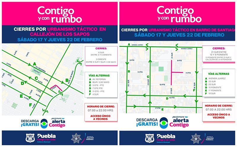 Estas intervenciones –conocidas como urbanismo táctico— tendrán lugar en 3 Oriente y 6 Sur (Callejón de Los Sapos), adecuaciones provisionales de prioridad peatonal y criterios de sustentabilidad, eficiencia, inclusión, comodidad y seguridad, por lo que se mantendrá cerrada a la circulación vehicular; avenida Reforma, bulevar 5 de Mayo, 5 Oriente-Poniente, 7 Oriente, 11 Oriente y 4 Sur serán vías alternas.