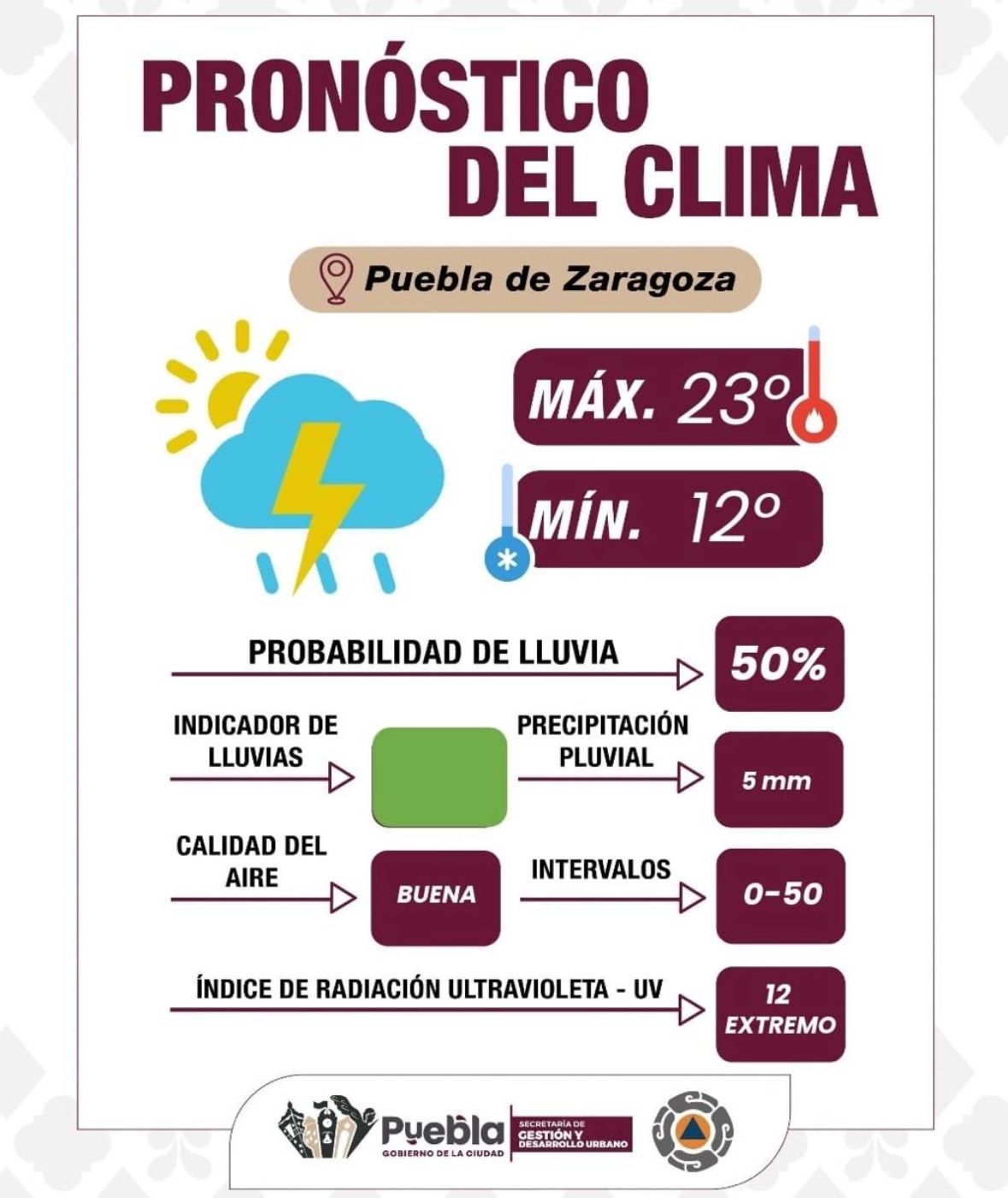 La Secretaría de Gestión y Desarrollo Urbano, a través de su Dirección de Gestión de Riesgos, informa a la ciudadanía el pronóstico hidrometeorológico para este día con base en los reportes oficiales de la Comisión Nacional del Agua (CONAGUA) y el Sistema Meteorológico Nacional (SMN), en el marco del monitoreo permanente de fenómenos naturales que puedan representar un riesgo para la población.