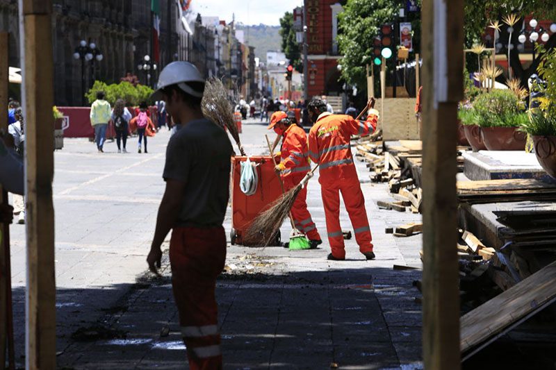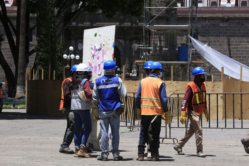 En el punto del retiro de tapiales se encuentra personal de la Gerencia del Centro Histórico y Patrimonio Cultural para verificar el correcto manejo del material para no dañar la zona, así como del Organismo Operador del Servicio de Limpia del municipio de Puebla para el retiro de escombro y apoyo al personal de Sedatu.