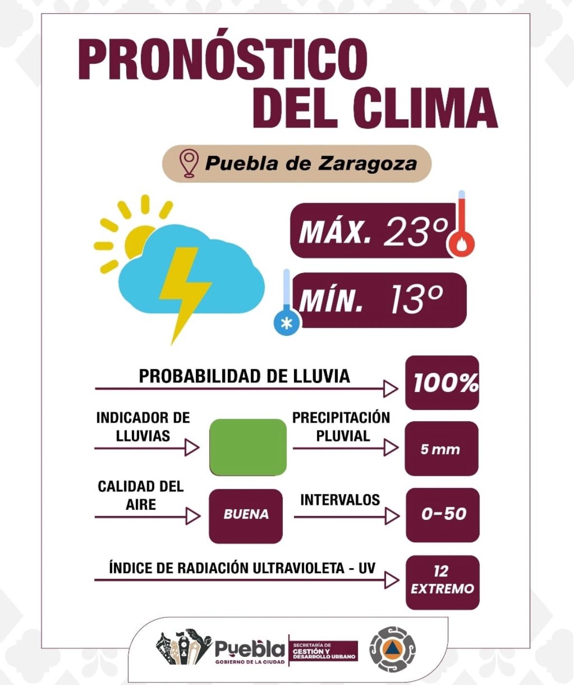 Para este día se pronostica un clima parcialmente nublado, con alta probabilidad de lluvia acompañada de tormenta eléctrica durante la tarde, especialmente alrededor de las 16:00 horas, con una acumulación estimada de entre 0 y 5 mm. La temperatura oscilará entre una máxima de 23°C y una mínima de 13°C.