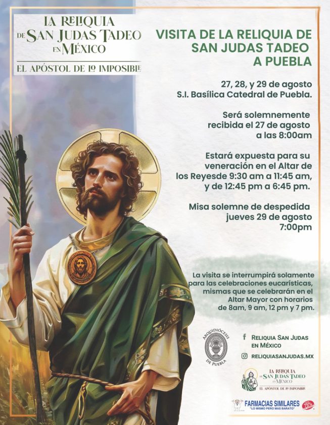 El arzobispo de Puebla, monseñor Víctor Sánchez Espinosa, anunció que las reliquias de San Judas Tadeo estarán en la Catedral de Puebla del 27 al 29 de agosto de 2024.