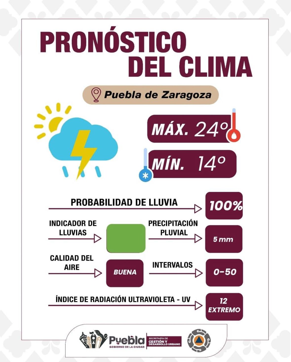 El Gobierno de la Ciudad informa las condiciones meteorológicas para este domingo: se espera un día nublado con alta probabilidad de lluvias acompañadas de tormentas eléctricas entre las 16:00 y las 20:00 horas, con una acumulación estimada de 5 mm. La temperatura oscilará entre una máxima de 24°C y una mínima de 14°C. Se recomienda a la población tomar precauciones adicionales debido al índice UV extremo, así como aprovechar las buenas condiciones de calidad del aire, que se reporta como buena.