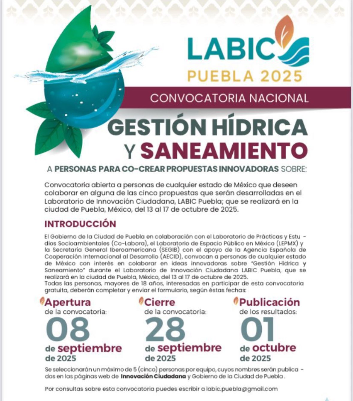 El Gobierno de la Ciudad, encabezado por el presidente municipal, Pepe Chedraui, a través de la Secretaría de Medio Ambiente a cargo de Iván Herrera, anuncia el lanzamiento de la convocatoria nacional para participar en el Laboratorio de Innovación Ciudadana LABIC Puebla 2025, una iniciativa que busca co-crear soluciones innovadoras a los desafíos del agua y el saneamiento.