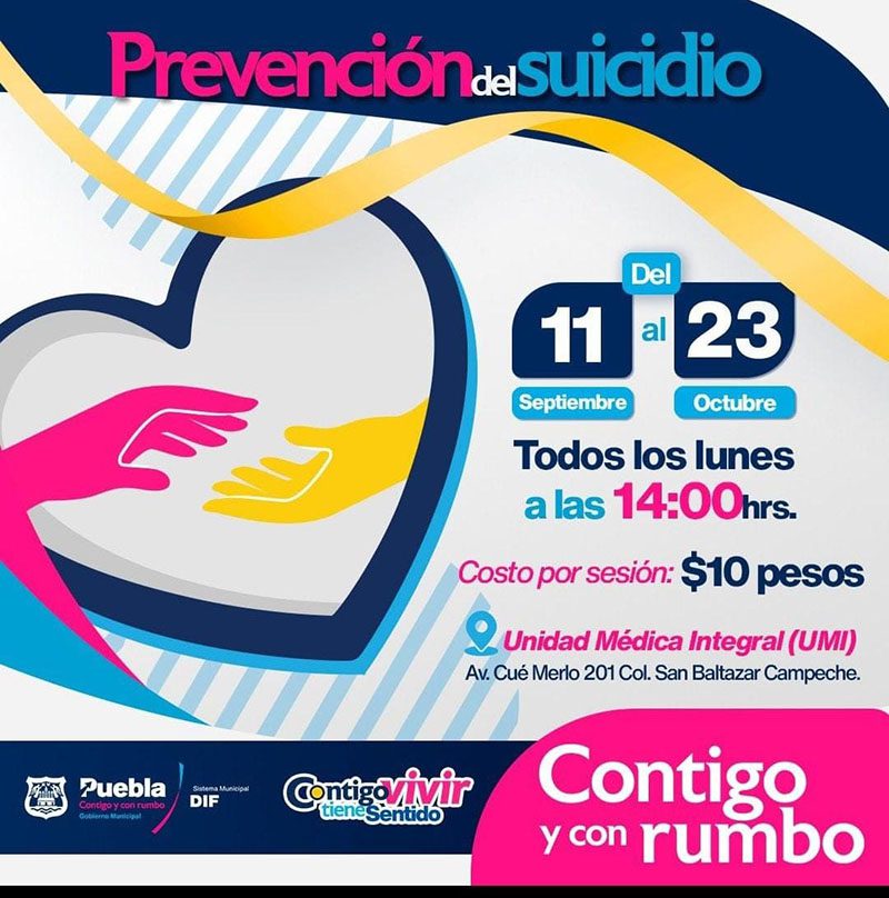Como parte de la Estrategia ‘Contigo Vivir Tiene Sentido’, el Sistema Municipal DIF (SMDIF) de Puebla brinda contención y atención a personas con ideas o intenciones autodestructivas, así como, para capacitar a la familia y red de apoyo a través de talleres, pláticas e intervenciones en medios de comunicación, podcast y contenido en la plataforma digital ‘Equilíbrate’ que está presente 24/7 a disposición de quienes la necesiten.