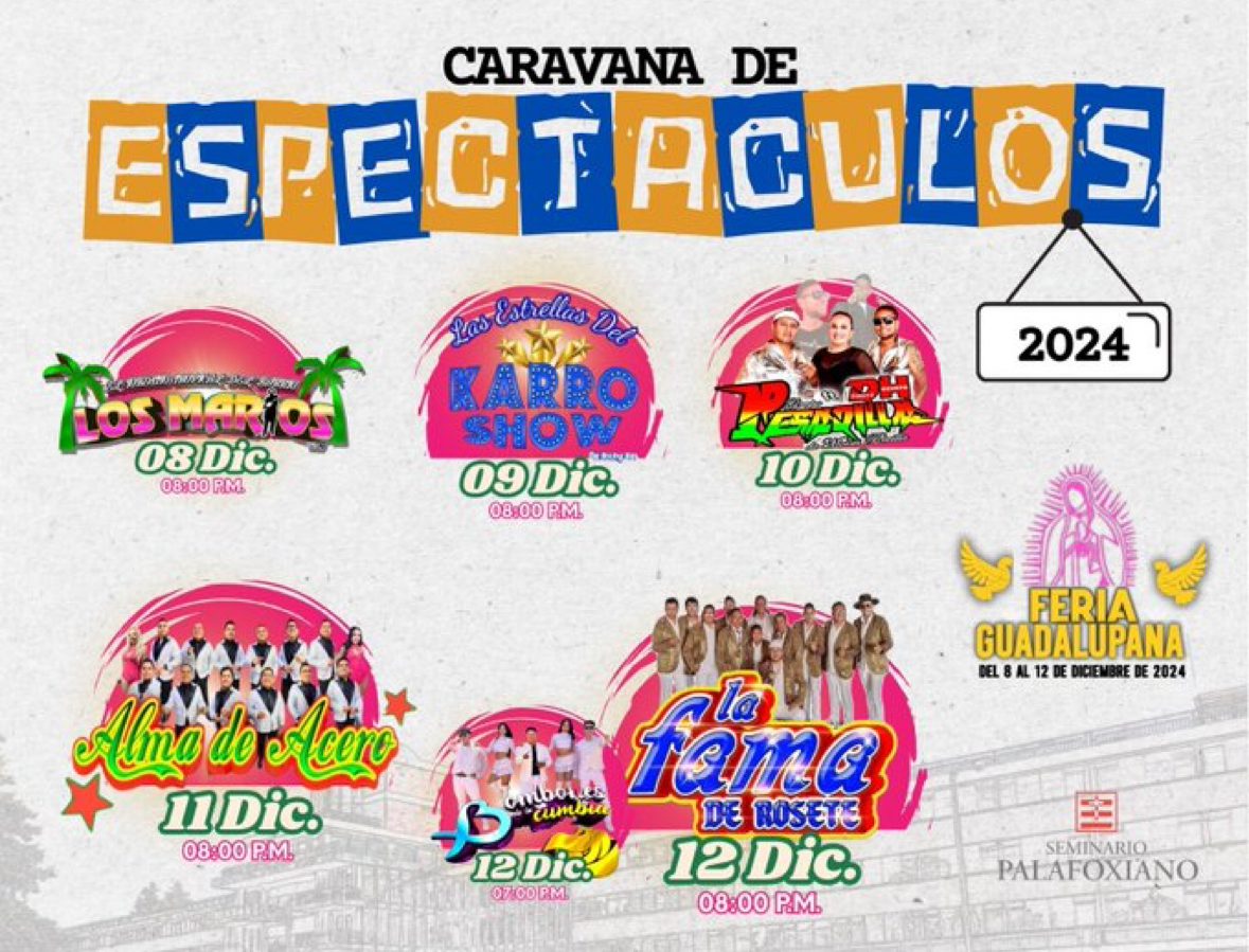 Del 08 al 12 de diciembre 2024 se llevará a cabo la edición 63 de la Feria Guadalupana, “la feria más familiar de Puebla”, en las instalaciones del Seminario Mayor Palafoxiano, donde habrá juegos mecánicos, antojitos, venta de artesanías y espectáculos.