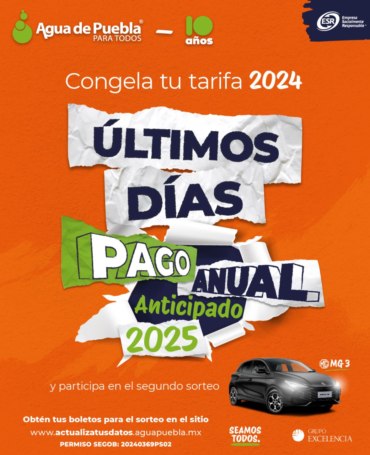 Agua de Puebla para Todos informa que el próximo viernes 31 de enero es el último día para realizar el Pago Anual Anticipado con tarifas congeladas del 2024 para todo este año 2025, sin incremento alguno, por lo que No habrá más prórroga de este beneficio.