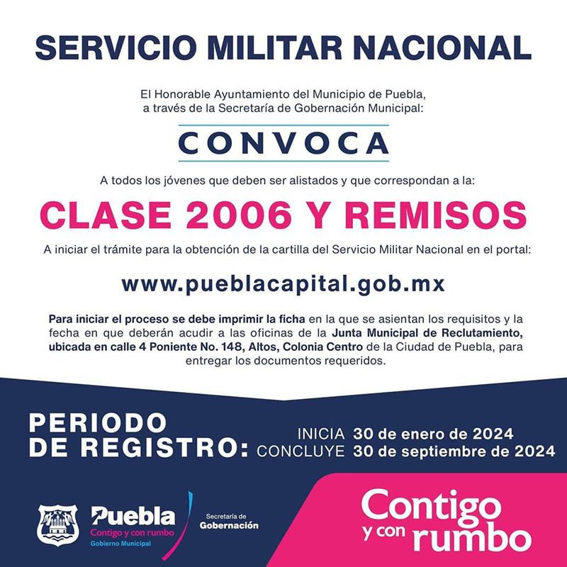 El Ayuntamiento de Puebla –que preside Adán Domínguez Sánchez– a través de la Secretaría de Gobernación Municipal, invita a los jóvenes Clase 2006 y remisos, a realizar su registro para obtener la Cartilla del Servicio Militar Nacional, trámite que entra en la última semana y que estará abierto hasta el 30 de septiembre de 2024.