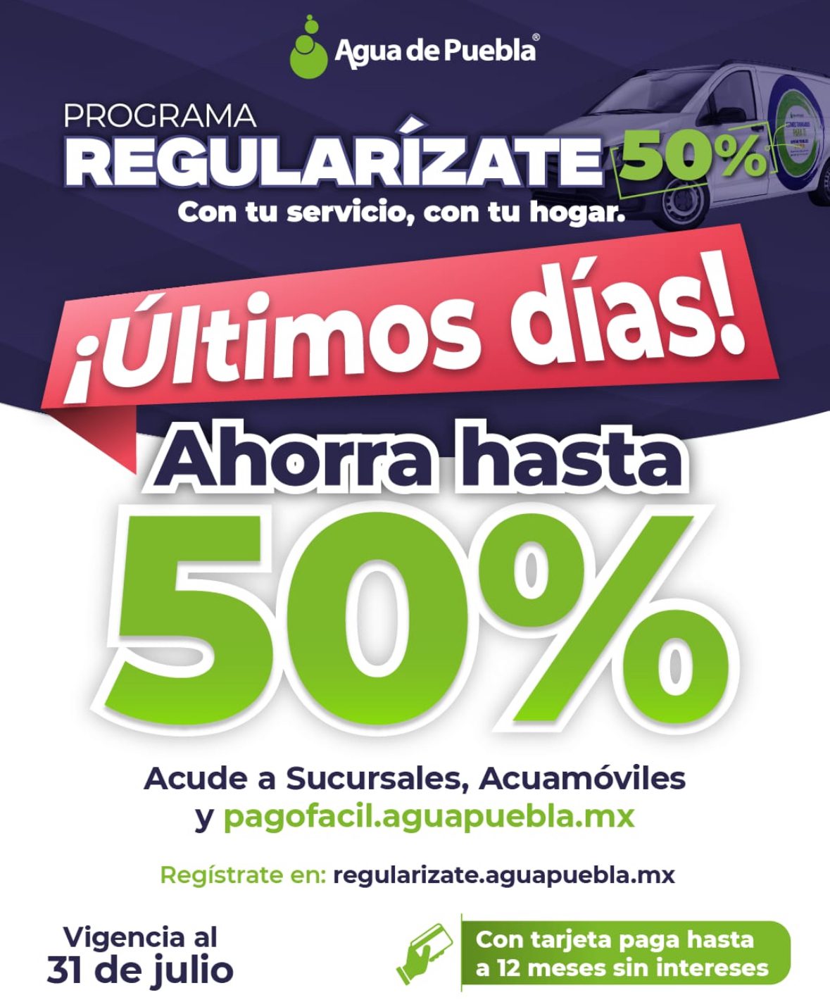 Agua de Puebla informa que el próximo jueves 31 de julio es el último día para aprovechar los grandes beneficios del Programa Regularízate, conahorros hasta del 50% al liquidar su adeudo de los servicios de agua potable, drenaje y saneamiento.