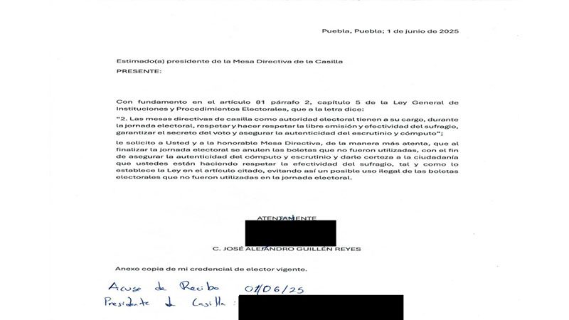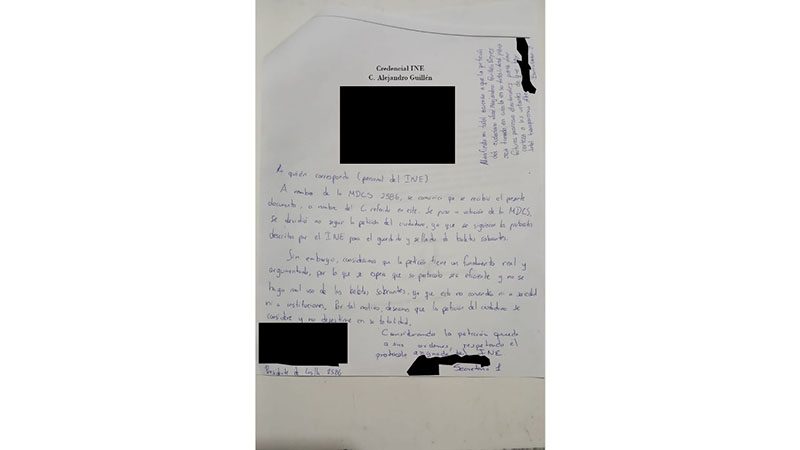Mi escrito fue turnado a las autoridades del INE correspondientes, pero en él escribieron tres párrafos, de los cuales los dos primeros fueron firmados al calce por el presidente y la secretaria y el tercero por uno de los escrutadores. El segundo de estos párrafos dice: