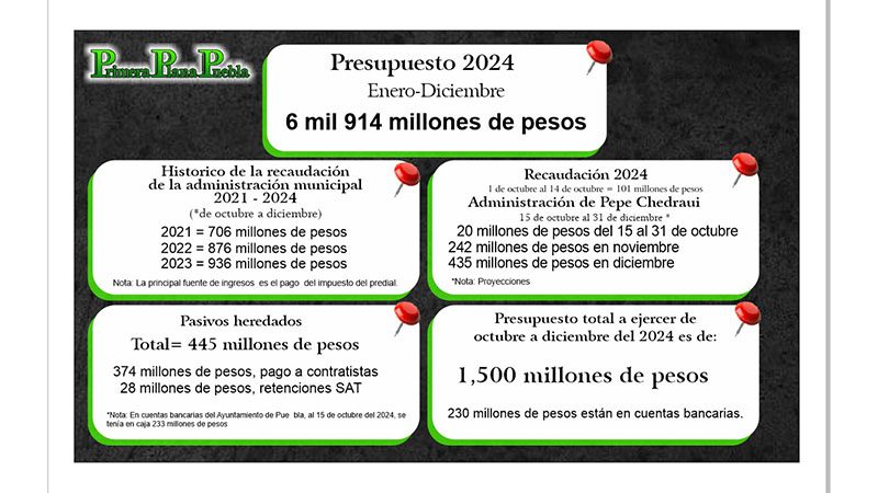 Lo cierto es que con todos estos números presentados y que se pueden consultar dentro de la ley de ingresos y el presupuesto de egresos del ayuntamiento de Puebla para el ejercicio fiscal 2024, queda claro que no existe ningún hoyo financiero y si una ambición desmedida por contar con más recursos por parte de la nueva administración chedrauista.