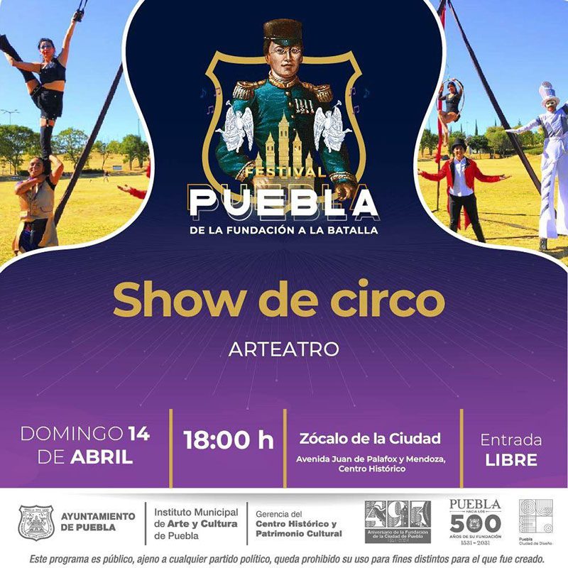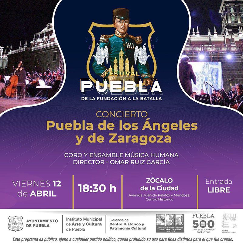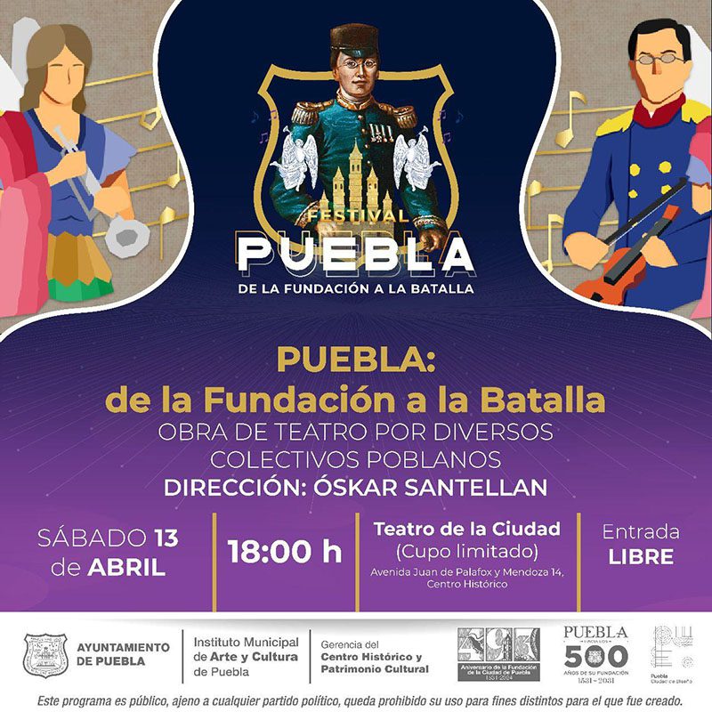 El Ayuntamiento de Puebla informa sobre las actividades artísticas y culturales que serán parte de la conmemoración del 493 aniversario de la fundación de la ciudad, así como por la Batalla de 5 de Mayo, este viernes 12, sábado 13 y domingo 14 de abril.