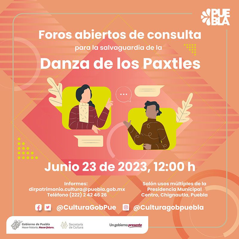 En el foro será abordada información sobre la “Danza de los Paxtles”, los elementos que componen a la misma, los valores culturales que representa para los portadores y las circunstancias actuales bajo las que se lleva a cabo; para continuar con la consulta sobre si los portadores están de acuerdo en que se lleve a cabo la emisión de la declaratoria de Patrimonio Cultural.