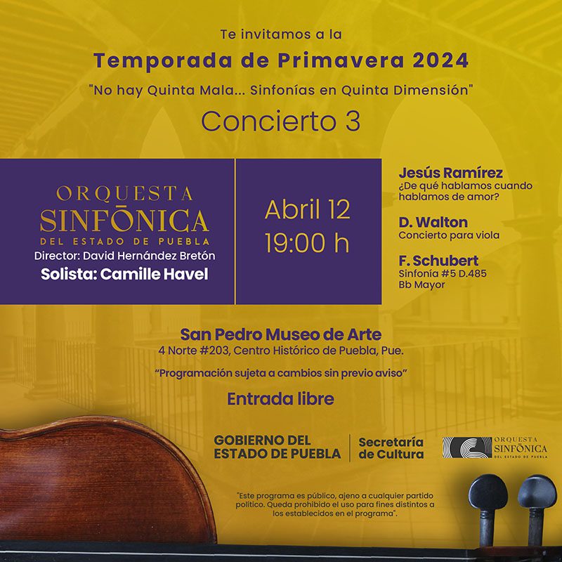 Asimismo, el 05 de abril, la agrupación interpretará “Divertimento” de E. de Zubeldía, “Serenade After Plato´s Symposium” de Leonard Bernstein y “Sinfonía #5 op.47 re menor” de D. Shostakóvich; mientras que el día 12 del mismo mes serán “¿De qué hablamos cuando hablamos de amor?” de Jesús Ramírez, “Concierto para viola” de D. Walton y “Sinfonía #5 D.485 Bb Mayor” de F. Schurbert. En dichas fechas colaborarán los solistas Leónidas Cáceres y Camille Havel, respectivamente.