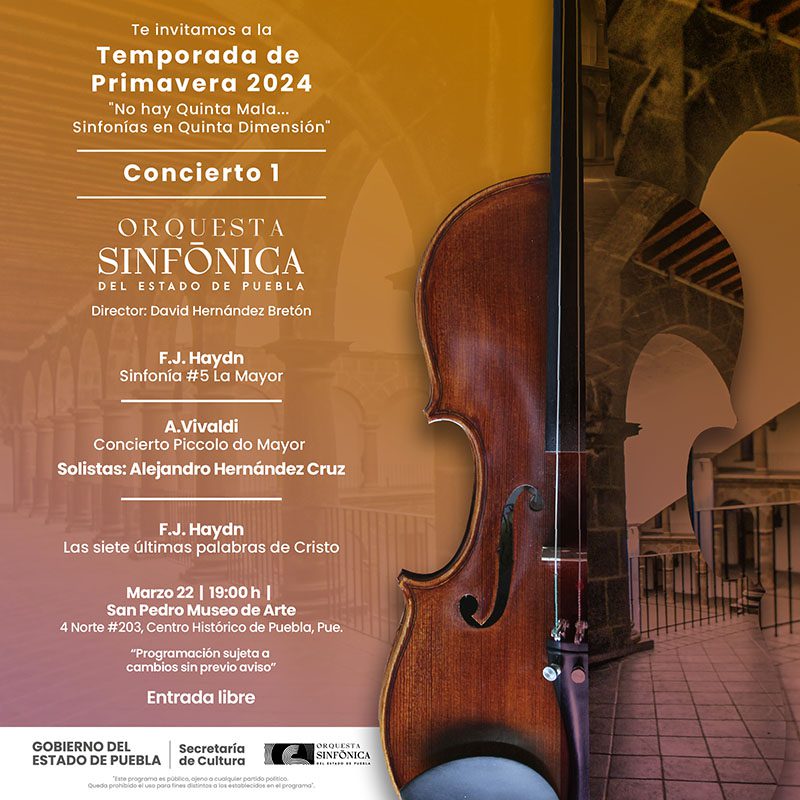 Bajo la dirección de David Hernández Bretón, dicha orquesta, fundada en 2002 e integrada actualmente por 81 músicos profesionales, presentará en el primer concierto las piezas musicales “Sinfonía #5 La Mayor” y “Las siete últimas palabras de Cristo”, del compositor F. J. Haydn, y el “Concierto Piccolo do Mayor” de A. Vivaldi, con la participación del solista, Alejandro Hernández Cruz.