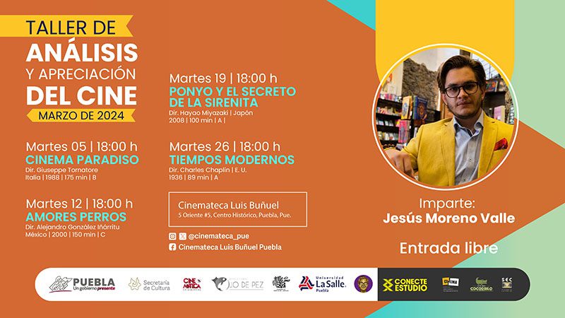 El gobierno presente de Sergio Salomón, a través de la Secretaría de Cultura, realizará en la Cinemateca “Luis Buñuel” el “Taller de análisis y apreciación del cine”, a cargo de Jesús Moreno Valle, licenciado en comunicación y medios digitales, con el fin de impulsar, promover y difundir la cultura cinematográfica entre la sociedad poblana.