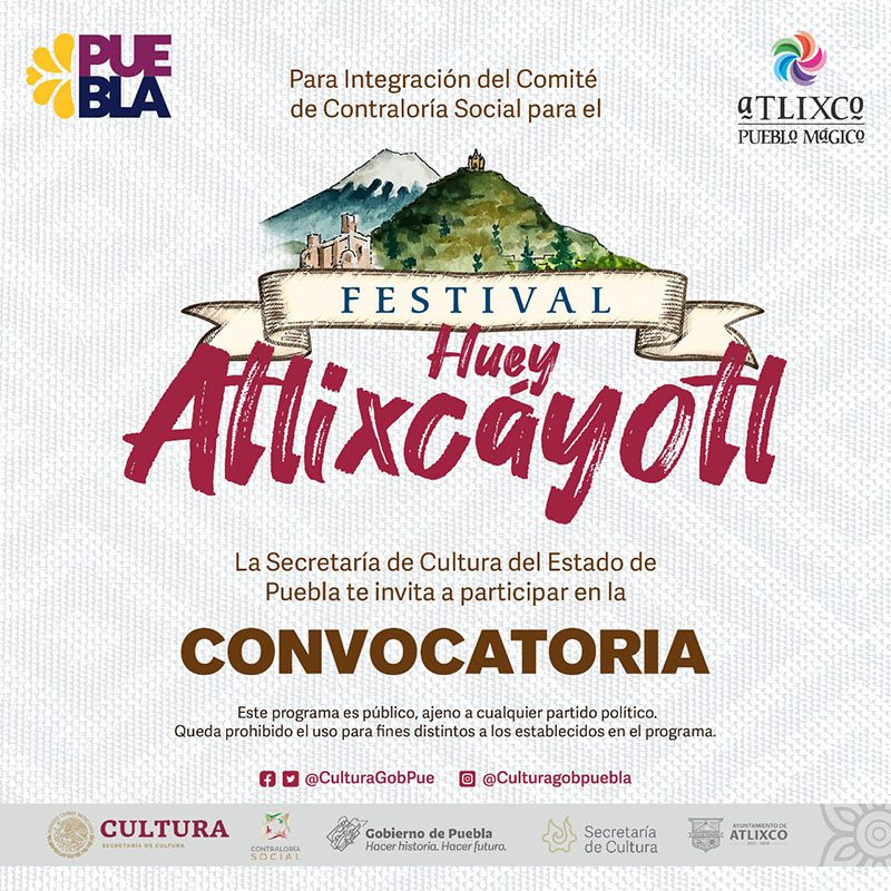 Con el fin de ejecutar un ejercicio de transparencia y rendición de cuentas en el “Festival Huey Atlixcáyotl 2022”, la Secretaría de Cultura convoca a las y los atlixquenses a participar en la convocatoria para ser representantes del Comité de Contraloría Social de dicho evento.
