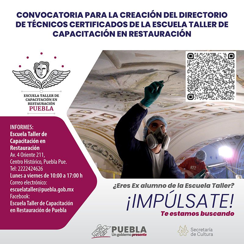 Para obtener más información, las y los interesados pueden acudir a las instalaciones de la Escuela Taller (4 Oriente número 211, Centro Histórico), comunicarse de lunes a viernes, de 10:00 a 17:00 horas, al correo electrónico escuelataller@puebla.gob.mx o al teléfono 22 22 42 46 26, así como consultar la página de Facebook “Escuela Taller de Capacitación en Restauración de Puebla”.
