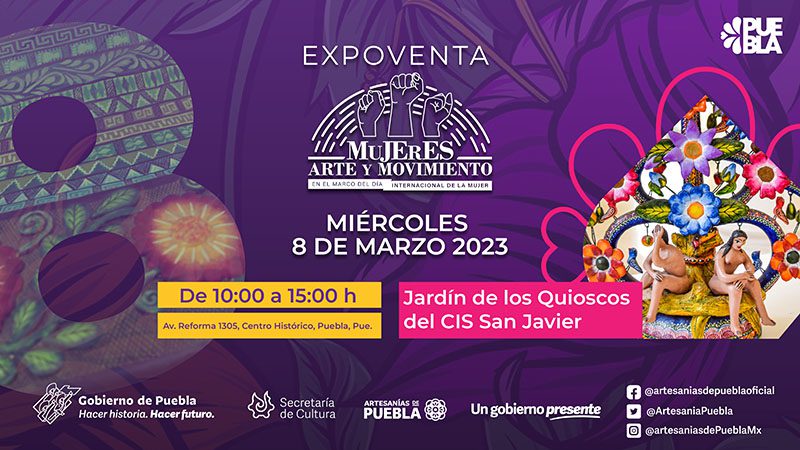 Como parte del programa “Mujeres, arte y movimiento”, desarrollado en conmemoración del Día Internacional de la Mujer (8 de marzo), el gobierno estatal, por medio de la Secretaría de Cultura, realizará una expoventa de artesanías en el jardín de los quioscos del Centro Integral de Servicios (CIS) “San Javier” (Avenida Reforma 1305, Centro Histórico).