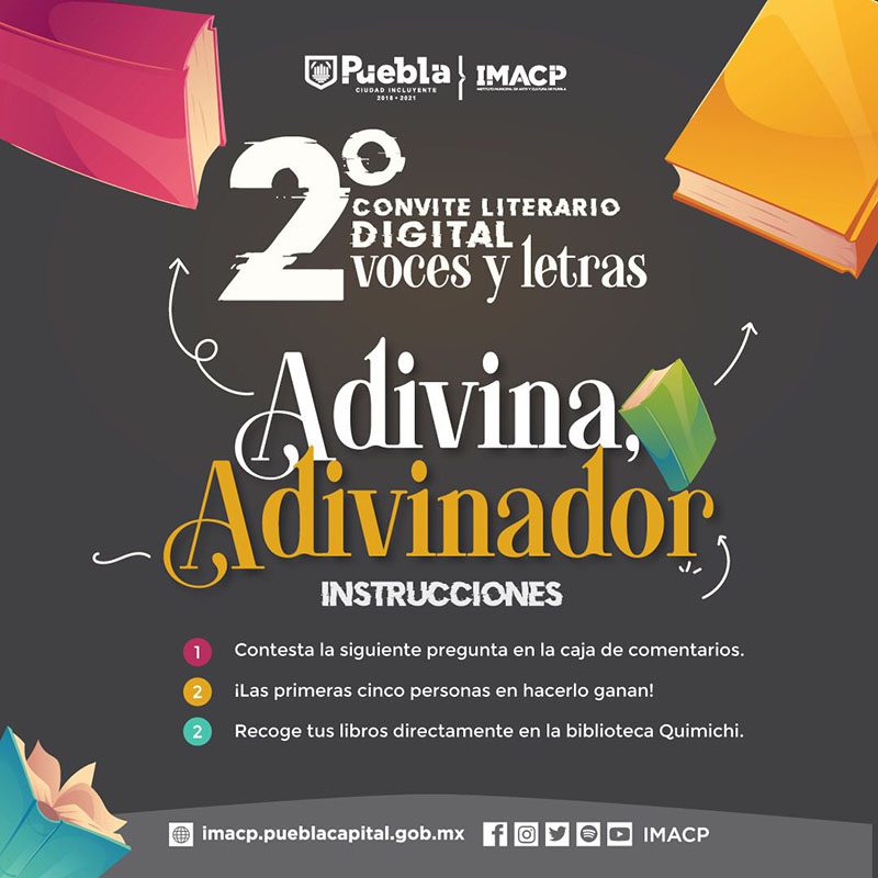 El Instituto Municipal de Arte y Cultura (IMACP) del Ayuntamiento de Puebla, a través de su coordinación de Fomento a la Lectura, realiza la segunda emisión del “Convite literario: Voces y letras” de manera virtual, del 24 al 28 de agosto, donde se celebra a la lectura, al mismo tiempo que se difunde la obra de varios escritores locales.