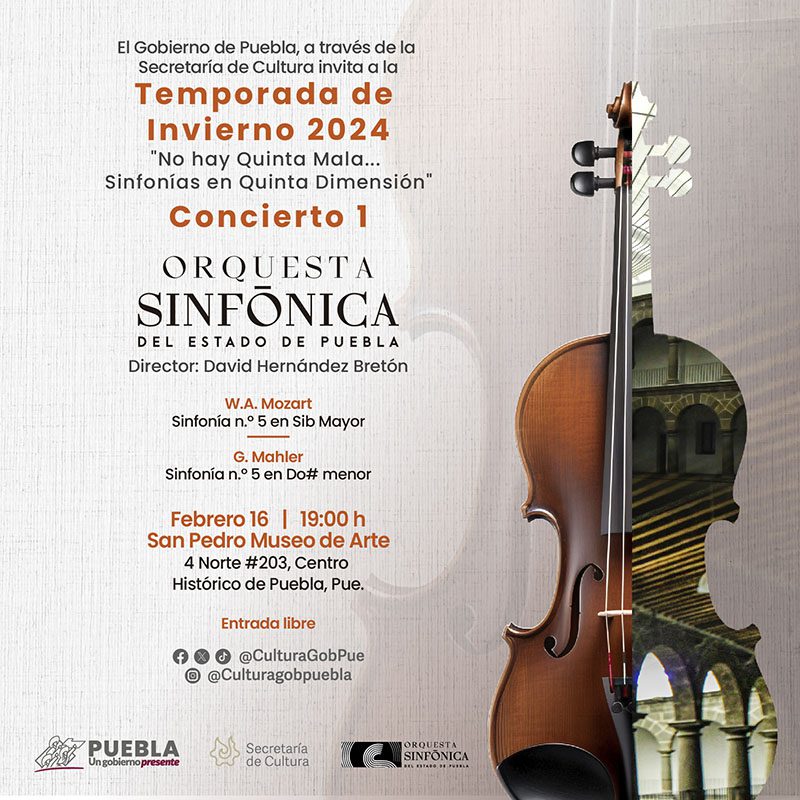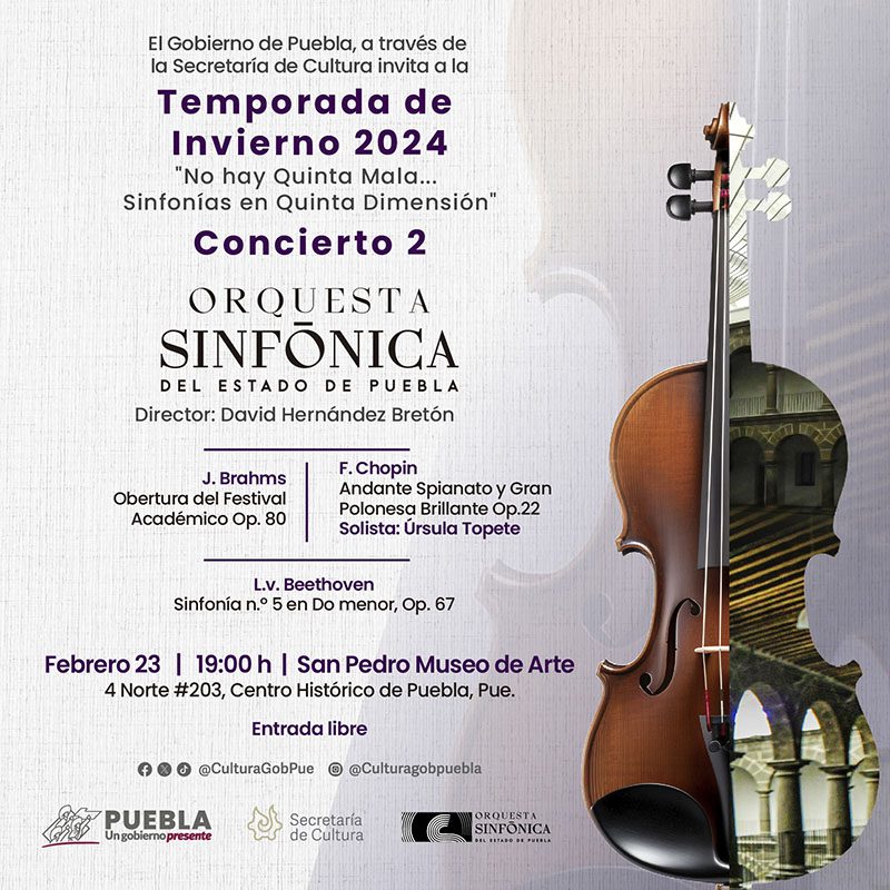 Este viernes 16 de febrero, el gobierno presente de Sergio Salomón, a través de la Secretaría de Cultura, iniciará los conciertos programados para la temporada de invierno de la Orquesta Sinfónica del Estado de Puebla (OSEP), titulada “No hay quinta mala… Sinfonías en quinta dimensión”.