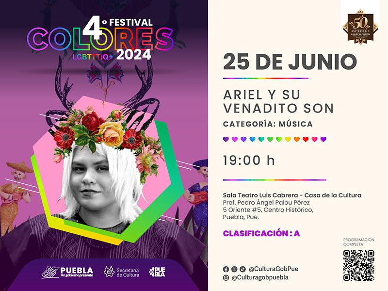Del 25 al 29 de junio, la cuarta edición del “Festival Colores” ofrecerá música, cine, teatro, danza y literatura hecha por la comunidad LGBTTTIQ+, en actividades a las que podrá asistir el público en general. La programación completa está disponible en las redes sociales Facebook (Secretaría de Cultura Puebla) y X (@Culturagobpue).