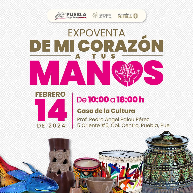 A fin de potencializar el trabajo de artesanas y artesanos de la entidad, el gobierno presente de Sergio Salomón, a través de la Secretaría de Cultura, instalará la expoventa “De mi corazón a tus manos”, para promover la comercialización y uso de artesanías poblanas en la celebración del Día de San Valentín (14 de febrero).
