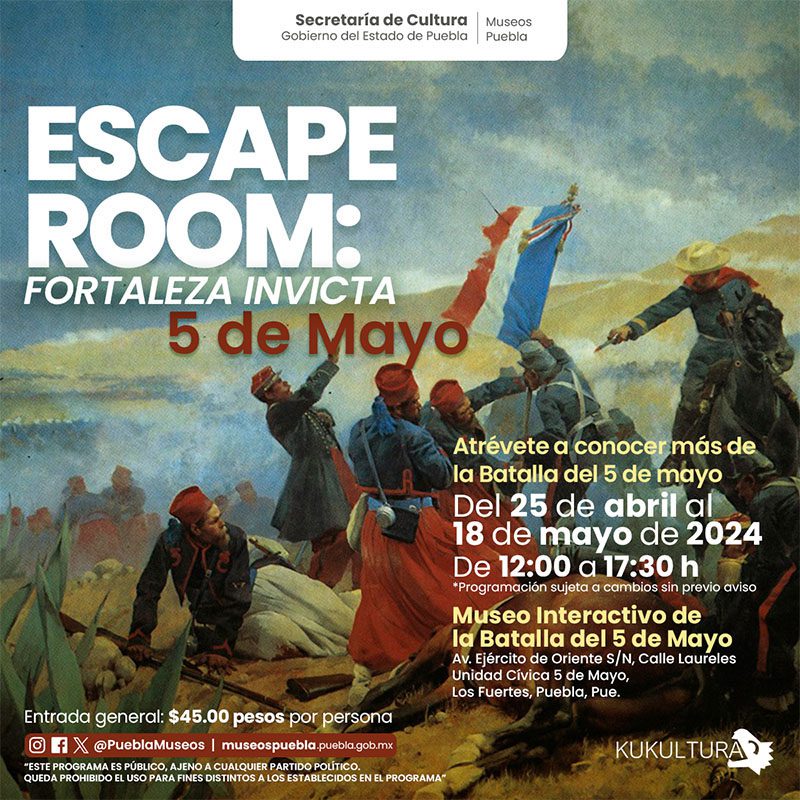 En tanto, hasta el 12 de mayo en la Feria de Puebla, las y los poblanos, así como visitantes y turistas, podrán disfrutar de “Escape Room 5 de mayo: Fortaleza invicta”, una experiencia interactiva con juegos y acertijos para conocer más de la Batalla de Puebla, lo anterior en el Museo Interactivo del 5 de Mayo (Avenida Ejército de Oriente s/n, Los Fuertes). Además, este mes la “Noche de Museos” será el sábado 18 de mayo.