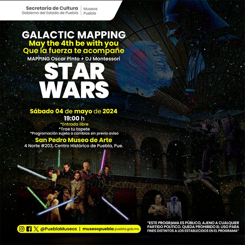 San Pedro Museo del Arte (4 Norte número 203, Centro Histórico) se sumará al “Día de Star Wars” con una “Galactic Mapping + DJ”, una proyección digital mediante la cual los asistentes disfrutarán de escenas alusivas a la película; las y los interesados deberán ir con disfraces o accesorios de la Guerra de las Galaxias el sábado 04 de mayo, a partir de las 19:00 horas.