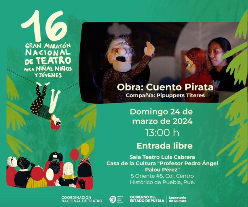 En Puebla, tendrán lugar las puestas teatrales “Hamonlet” de la compañía Trofofón Espectacular, a las 12:00 horas, y “Cuento Pirata” de Pipuppets Títeres, a las 13:00 horas, en la Sala “Luis Cabrera” del recinto ubicado en la 5 Oriente número 5, Centro Histórico.