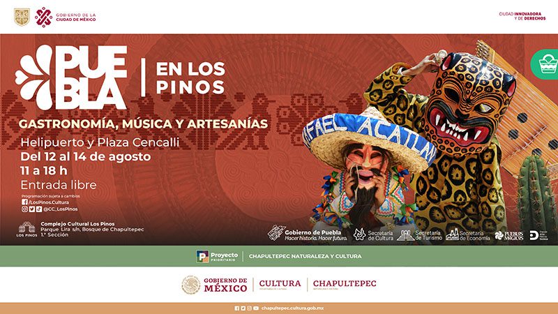 Del 12 al 14 de agosto, la Secretaría de Cultura presentará parte de la riqueza cultural de Puebla en el Complejo Cultural “Los Pinos”, mediante muestras artísticas, artesanales y gastronómicas que representan aspectos tradicionales y contemporáneos de las 32 regiones del estado.