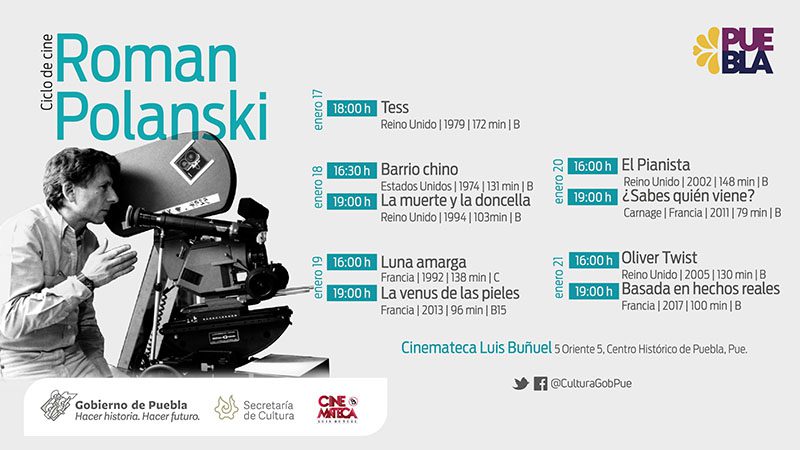 Por otro lado, las y los espectadores podrán disfrutar del ciclo dedicado al director de cine polaco Roman Polanski, que contempla las proyecciones de los filmes “Tess”, “Barrio Chino”, “La muerte y la doncella”, “Luna amarga”, “La venus de las pieles”, “El pianista”, “¿Sabes quién viene?”, “Oliver Twist” y “Basada en hechos reales”, del martes 17 al sábado 21 de enero.